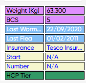 The patient sidebar now displays the patient's current BCS alongside their weight for at-a-glance health monitoring. These fields are only shown when a value has been recorded against the patient.