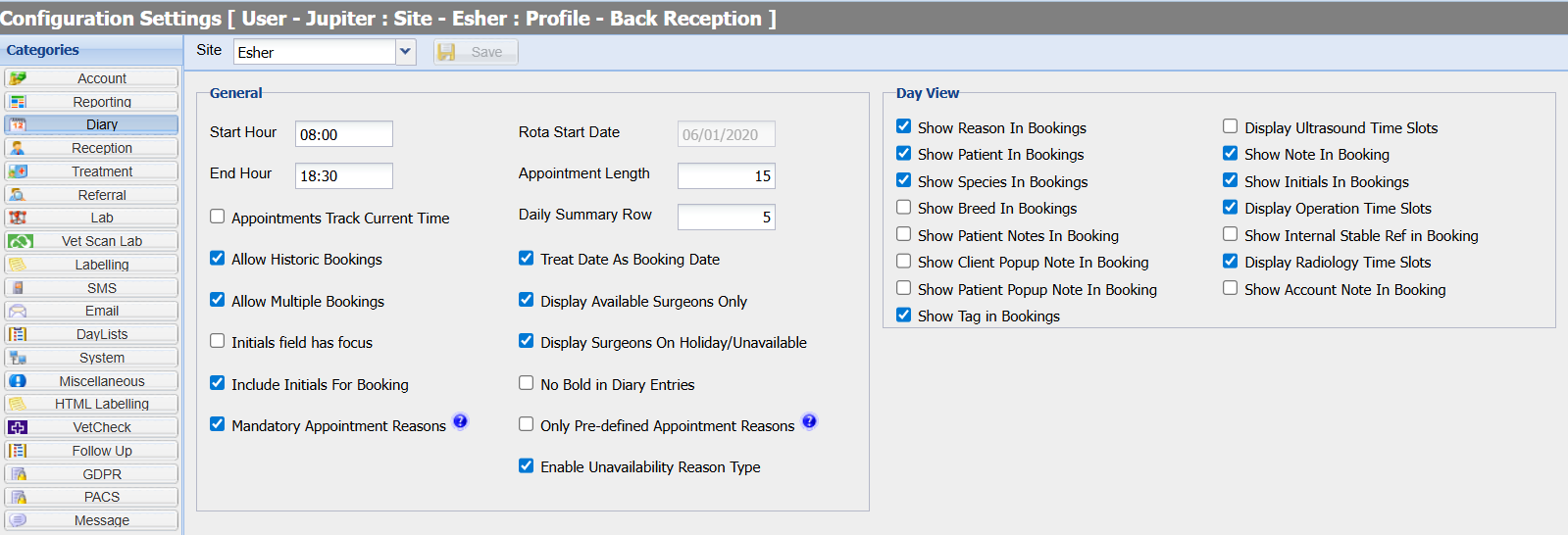 Enabled = Displays the patient's species on the diary's day view in the appointment slot.
