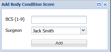 - Insert the patient's weight or BCS, select the Surgeon and select 'Add'.