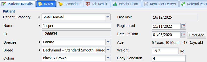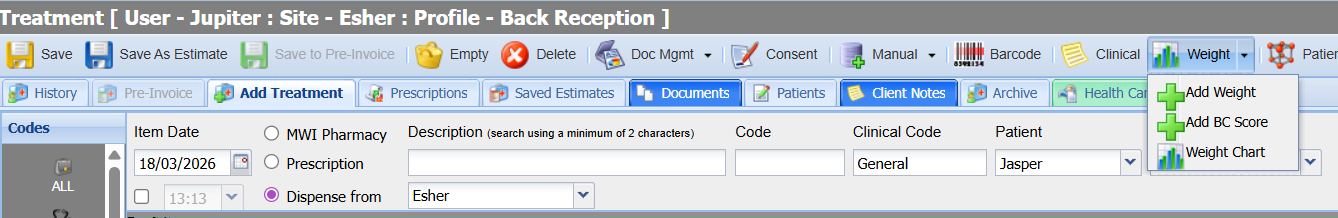 A Patient's Weight can be added through the Patient details screen, from any of the day lists, from the Treatment Screen or the Reception screen. This functionality allows you to add a Patient's weight to their treatment history with the ability to view their weight progress.
